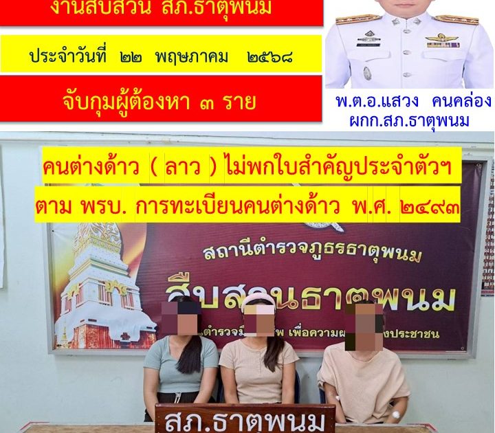 พ.ต.อ.แสวง คนคล่อง ผกก.สภ.ธาตุพนม มอบหมายให้ พ.ต.ท.ไพฑูลย์ ศิริพยัคฆ์ รอง ผกก.สส.สภ.ธาตุพนมพ.ต.ท.มุกดา นันทะพันธ์ สว.สส.สภ.ธาตุพนม ชุดจับกุม ร.ต.อ.เดชา ละศรีจันทร์ รอง สว.สส.สภ.ธาตุพนม พร้อมชุดสืบสวน สภ.ธาตุพนม จับกุมผู้ต้องหา 3 ราย