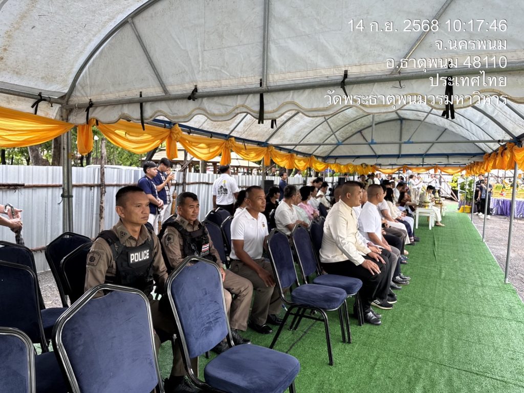 วันนี้ ( 14 ก.ย. 68)เวลา 09.30 น.โดยการอำนวยการของ พ.ต.อ.แสวง คนคล่องผกก.สภ.ธาตุพนม ,พ.ต.ท.ถนอมศักดิ์ ไชยบุรมย์ รอง ผกก.ป.ฯ พ.ต.ท.วิชัย วิทวงศ์ สวป.ฯ ได้มอบหมายให้ พ.ต.ต.อัมพร เสนาะเสียง สวป.ชส. ฯ พร้อมด้วย ร.ต.อ.ชื่น พันธุ์ศิลา รอง สว ป.ฯ ร้อยเวร ๒๐ พร้อมด้วย สายตรวจรถยนต์ ,จยย., จราจร ได้ร่วมพิธี และรักษาความสงบเรียบร้อย อำนวยความสะดวกด้านการจราจร ในงานพิธีบวงสรวงเพื่อความเป็นสิริมงคลเนื่องในการดำเนินโครงการบูรณะสระมุจลินทร์ (สระพังทอง) ณ วัดพระธาตุพนม วรมหาวิหาร