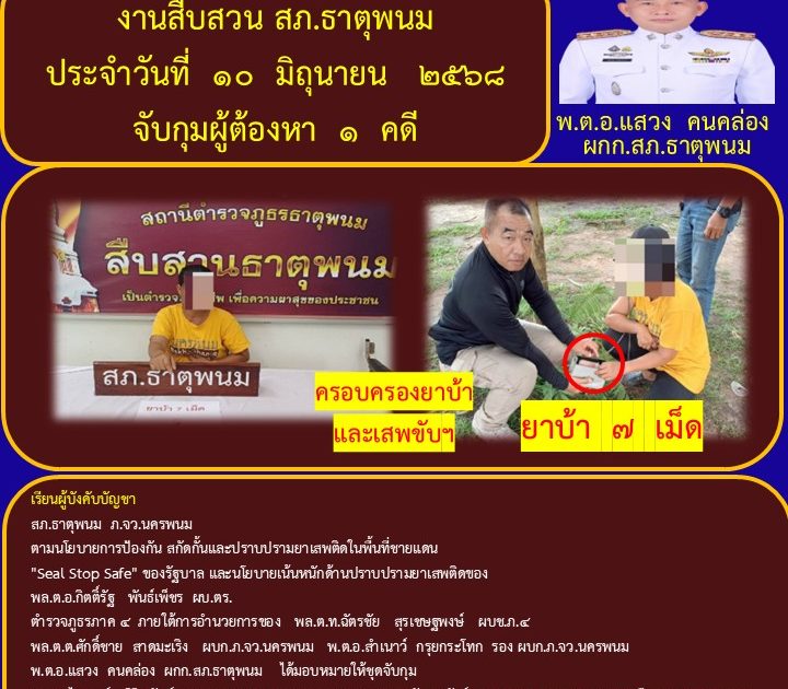 พ.ต.อ.แสวง คนคล่อง ผกก.สภ.ธาตุพนม ได้มอบหมายให้ชุดจับกุม พ.ต.ท.ไพฑูลย์ ศิริพยัคฆ์ รอง ผกก.สส.สภ.ธาตุพนม พ.ต.ท.มุกดา นันทะพันธ์ สว.สส.สภ.ธาตุพนม พร้อมชุดสืบสวน สภ.ธาตุพนม จับกุมผู้ต้องหา 1 คดี