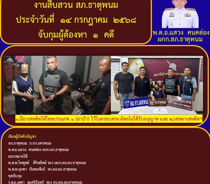พ.ต.อ.แสวง คนคล่อง ผกก.สภ.ธาตุพนม ได้มอบหมายให้ชุดจับกุมพ.ต.ท.ไพฑูลย์ ศิริพยัคฆ์ รอง ผกก.สส.สภ.ธาตุพนม