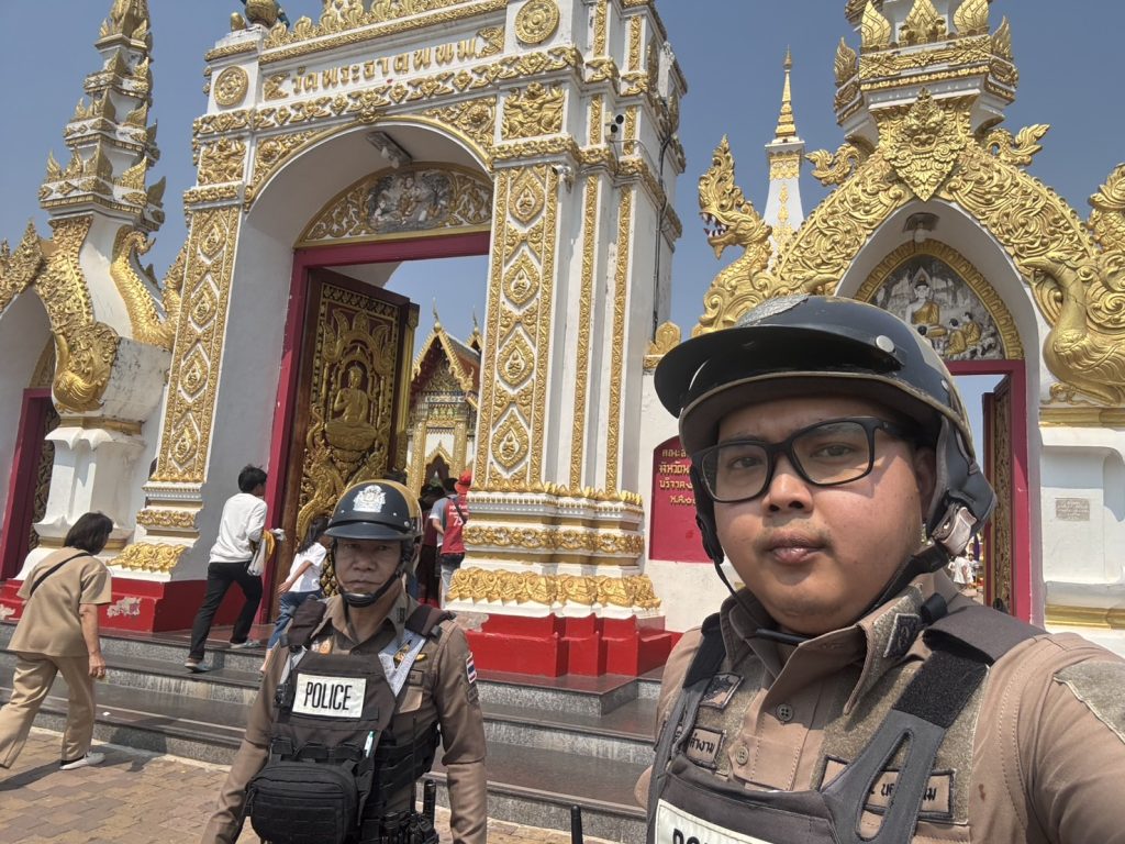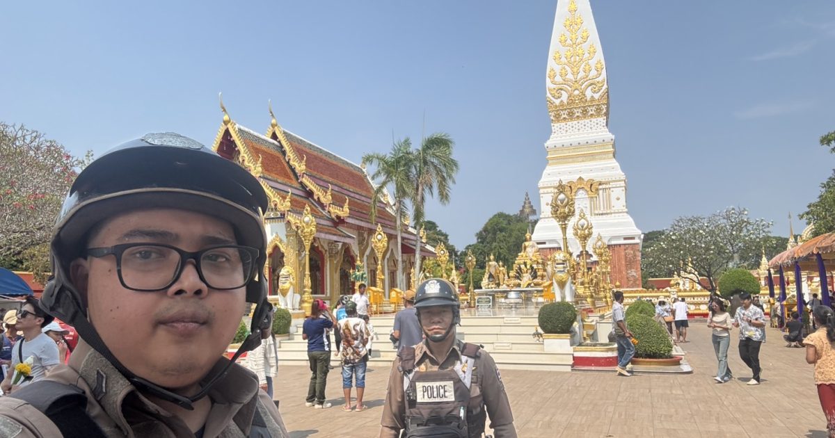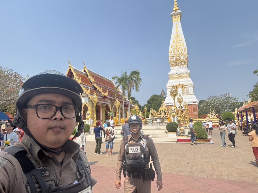 ชุดสายตรวจรถจักรยานยนต์ ออกตรวจป้องกันเหตุในพื้นที่บริเวณวัดพระธาตุพนม วรมหาวิหาร แก่นักท่องเที่ยวที่มากราบไหว้สักการะพระะาตุพนม เหตุการณ์ปกติ