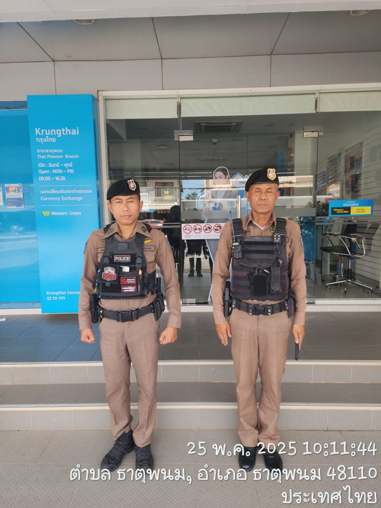 ร.ต.อ.ปรีชา บัวสิงห์ รอง สว.สส./ร้อยเวร 20 พร้อมชุดสายตรวจ รถจักรยานยนต์ ออกตรวจพื้นที่รับผิดชอบป้องกันเหตุ ตรวจจุดบังคับ/อื่นๆ ร้านสะดวกซื้อธนาคาร ร้านทอง ปั๊มน้ำมัน จุดเสี่ยง จุดล่อแหลม และบริเวณในวัดพระธาตุพนม วรมหาวิหาร เหตุการณ์ทั่วไปปกติ