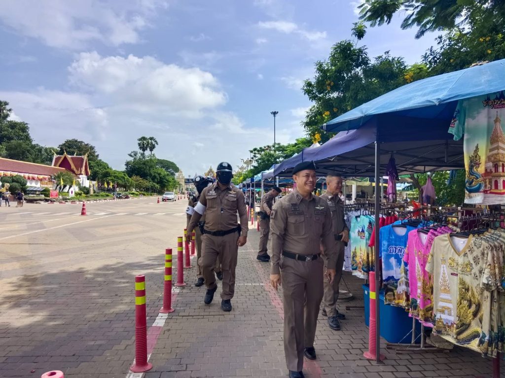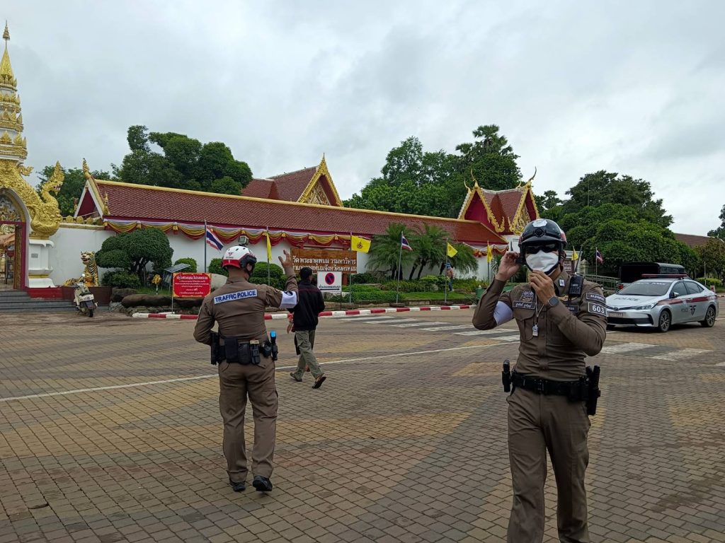พ.ต.ท.ถนอมศักดิ์ ไชยบุรมย์ รอง ผกก.ป.ฯ,พ.ต.ท.สมานศักดิ์ ศรีประเสริฐ สวป.สภ.ธาตุพนม พร้อมชุดจราจร อำนวยความสะดวกการจราจรเเละจัดระเบียบ ดูแลความเรียบร้อย ให้กับนักท่องเที่ยว บริเวณหน้าวัดพระธาตุพนม ภายในวัดพระธาตุพนม วรมหาวิหาร