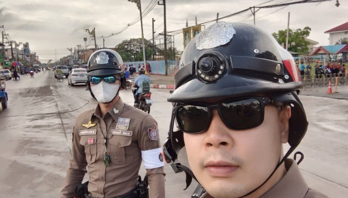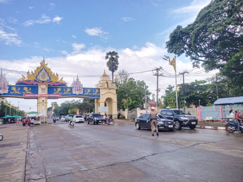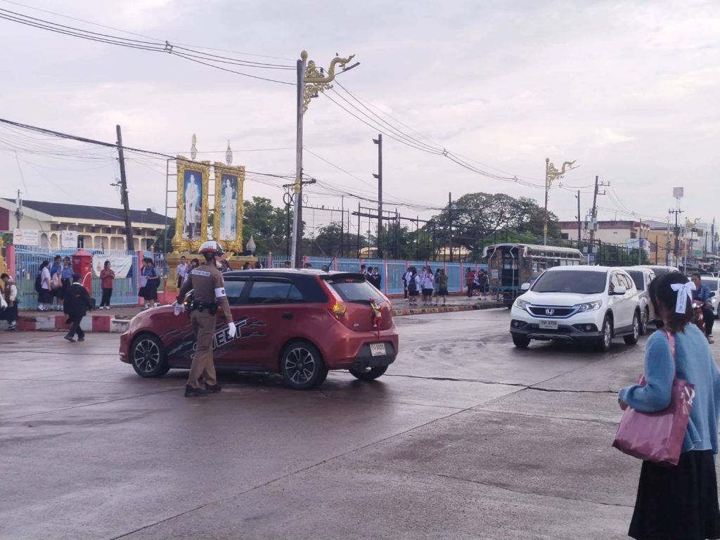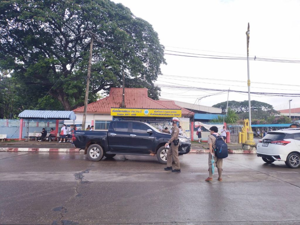 ร.ต.ต.ธีระพงษ์ ประขุนิงค์ รอง สว(จร.)สภ.ธาตุพนม พร้อมชุดจราจร อำนวยความสะดวกด้านการจราจร รร.ธาตุพนม เหตุการณ์ทั่วไปปกติ