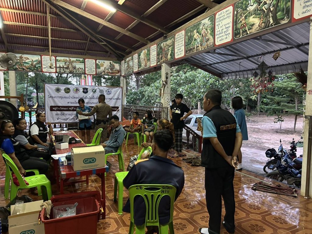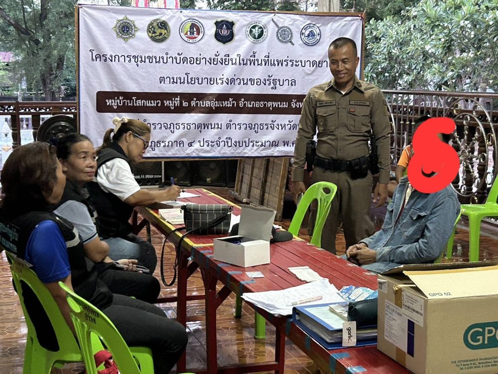 ร่วมกับฝ่ายปกครอง,สาธารณสุขออกพบปะเยี่ยมเยียนประชาชน และตรวจปัสสาวะกลุ่มเป้าหมายตามโครงการชุมชนยั่งยืนฯบ้านโสกแมว ม. 2 ต.อุ่มเหม้าอ.ธาตุพนม จ.นครพนม
