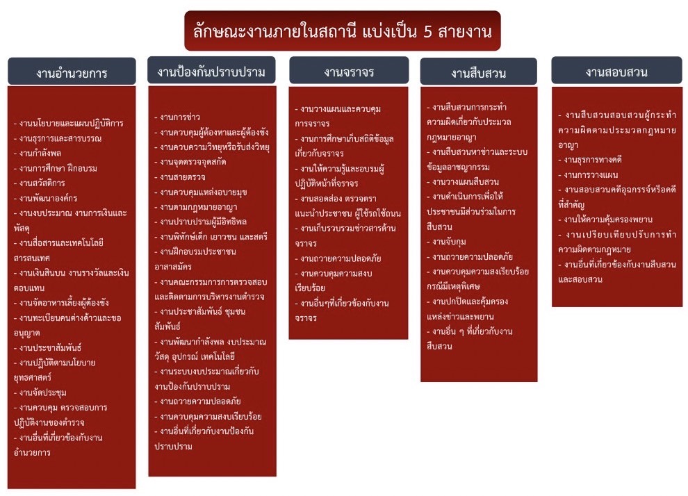 สถานีตำรวจ มีหน้าที่ตามประมวลกฎหมายวิธีพิจารณาความอาญา และตามกฎหมายอื่นอันเกี่ยวกับความผิดในคดีอาญาภายในเขตอำนาจการรับผิดชอบหรือเขตพื้นที่การปกครอง รวมถึงการรับผิดชอบในด้านการงานและการปกครองบังคับบัญชาถัดรองลงไปจากกองบังคับการตำรวจนครบาล(1-9) หรือตำรวจภูธรจังหวัด เพื่อรักษาความปลอดภัยในชีวิตและทรัพย์สิน ความมั่นคงภายใน บริการทางสังคม ชุมชน และมวลชนสัมพันธ์ การพัฒนางานบริหารและงานจเรตำรวจ การป้องกันปราบปรามอาชญากรรมและการรักษาความสงบเรียบร้อย รวมถึงงานกิจการพิเศษ และงานอื่น ๆ ที่เกี่ยวข้องกับสถานีตำรวจ ซึ่งงานในสถานีตำรวจ แบ่งออกเป็น 5 สายงาน ดังต่อไปนี้