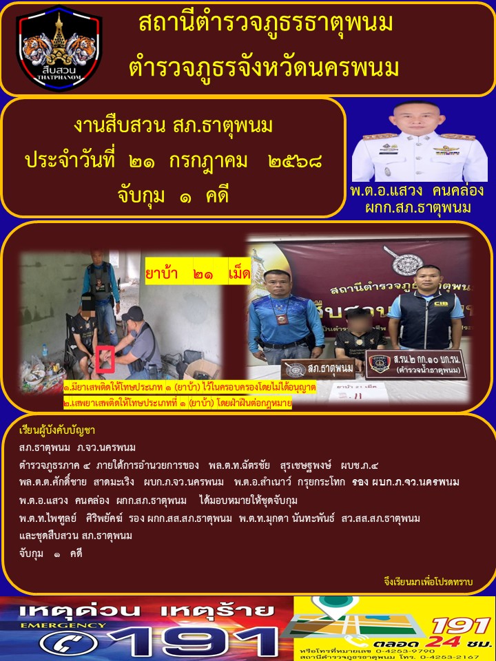 วันนี้(21 ก.ค.2568)เวลา13.30 น โดยการอำนวยการของ พ.ต.อ.แสวง คนคล่อง ผกก.สภ.ธาตุพนมมอบหมายให้ พ.ต.ท.ไ