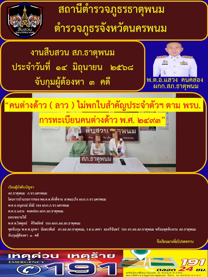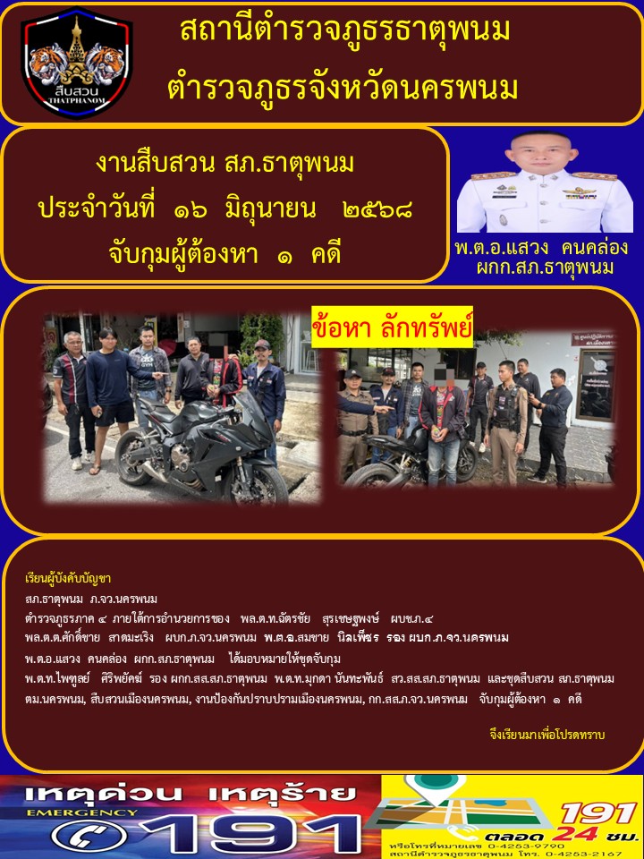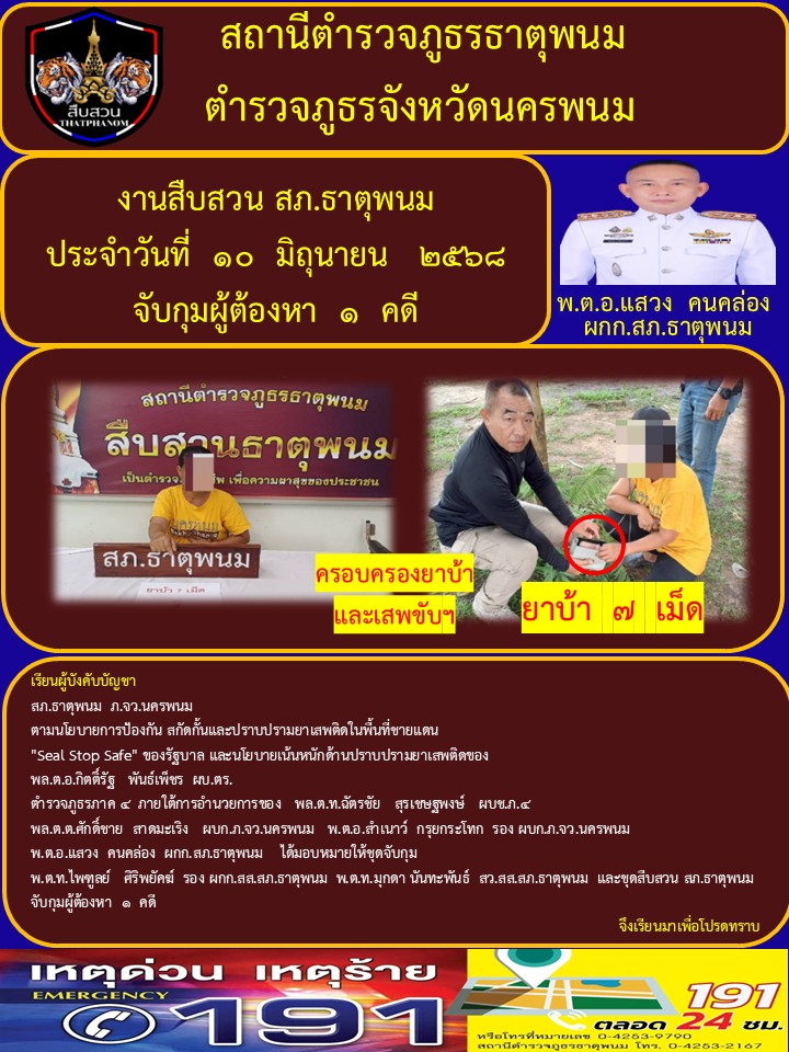 วันนี้( 16มิ.ย.2568)เวลา10.00 น โดยการอำนวยการของ พ.ต.อ.แสวง คนคล่อง ผกก.สภ.ธาตุพนมมอบหมายให้ พ.ต.ท.