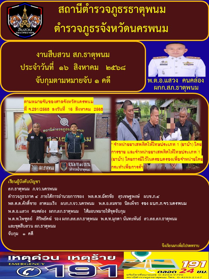 วันนี้ ( 16 ส.ค.68 )เวลา 09.00 น.โดยการอำนวยการของ พ.ต.อ.แสวง คนคล่อง ผกก.สภ.ธาตุพนม, พ.ต.ท.ถนอมศักด